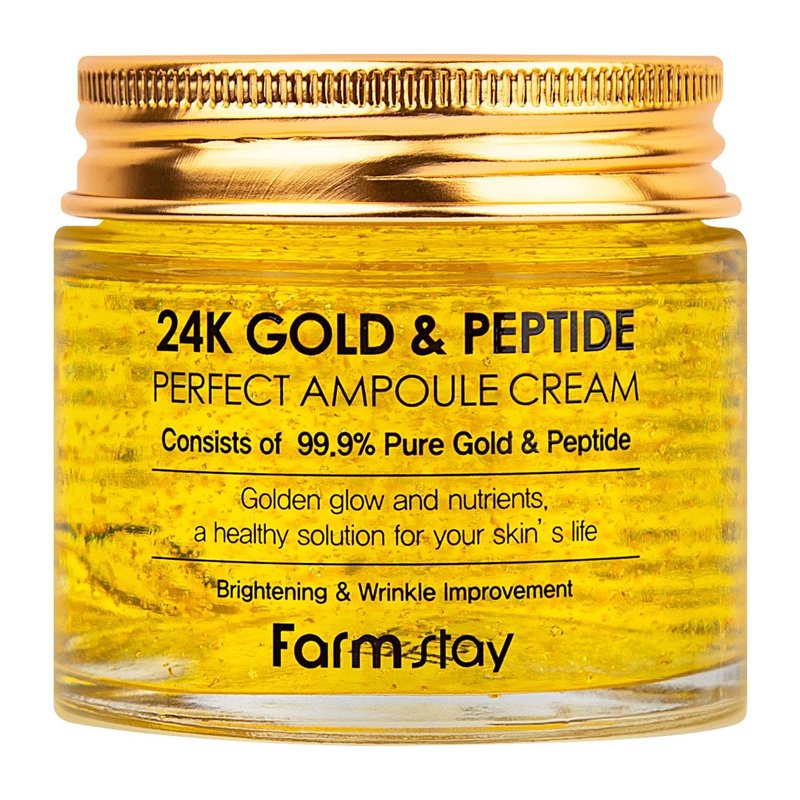 Farm Stay 24K Gold & Peptide Perfect Ampoule Cream gelio kremas su 24k auksu, peptidais ir adenozinu turi intensyvų stangrinanti poveikį odai, didina jos elastingumą ir stangrumą, išlygina veido spalvą ir šviesina amžiaus sukeltą pigmentaciją. Hialurono rūgštis giliai drėkina odą ir prisotina ją vitaminų. Propolis ir medaus ekstraktas turi antioksidantų, kurie saugo odą nuo laisvųjų radikalų neigiamo poveikio